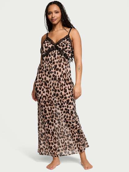 Spotted on runways everywhere: sexy animal prints. Our meant-to-be seen Slip Dress takes innerwear as outerwear to chic new heights in a semi-sheer, leopard-print chiffon offset with luxe lace.