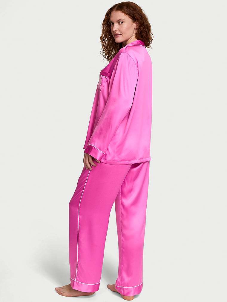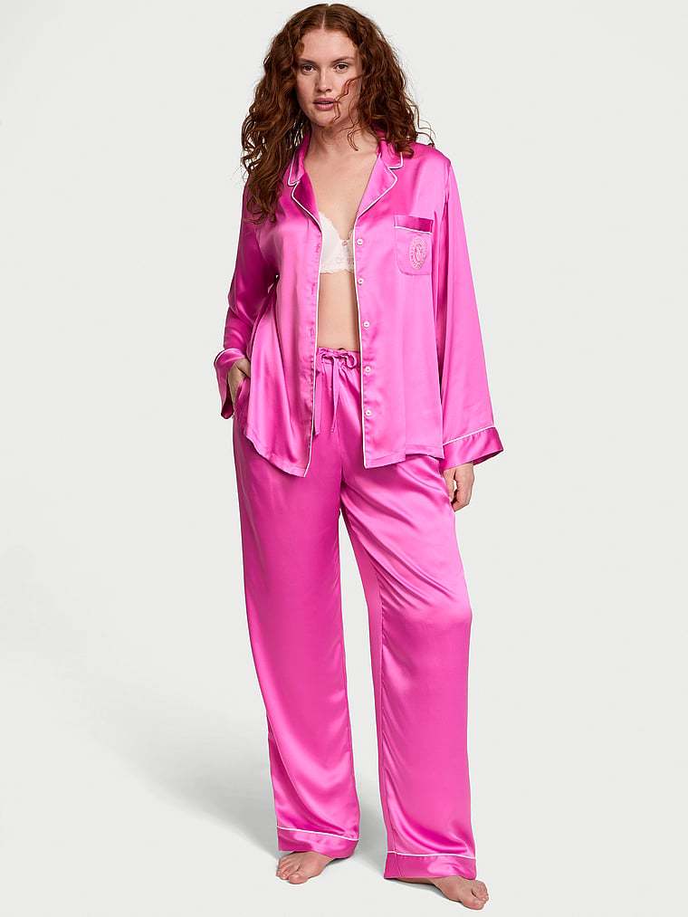 Wind down in this luxe satin pant and matching long-sleeve top with a chest pocket, notch collar, and decorative piping.