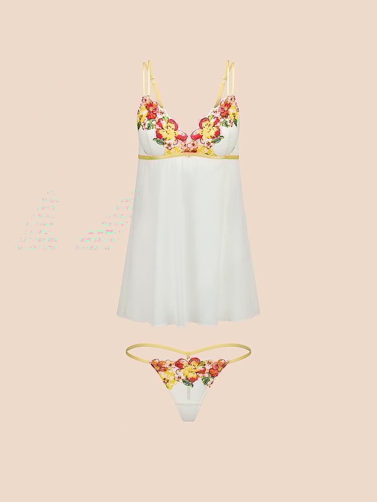 Playful and utterly romantic, this two-piece Babydoll set boasts sheer mesh and tropical floral lace. A supportive elastic underband and adjustable straps create a comfortable fit.