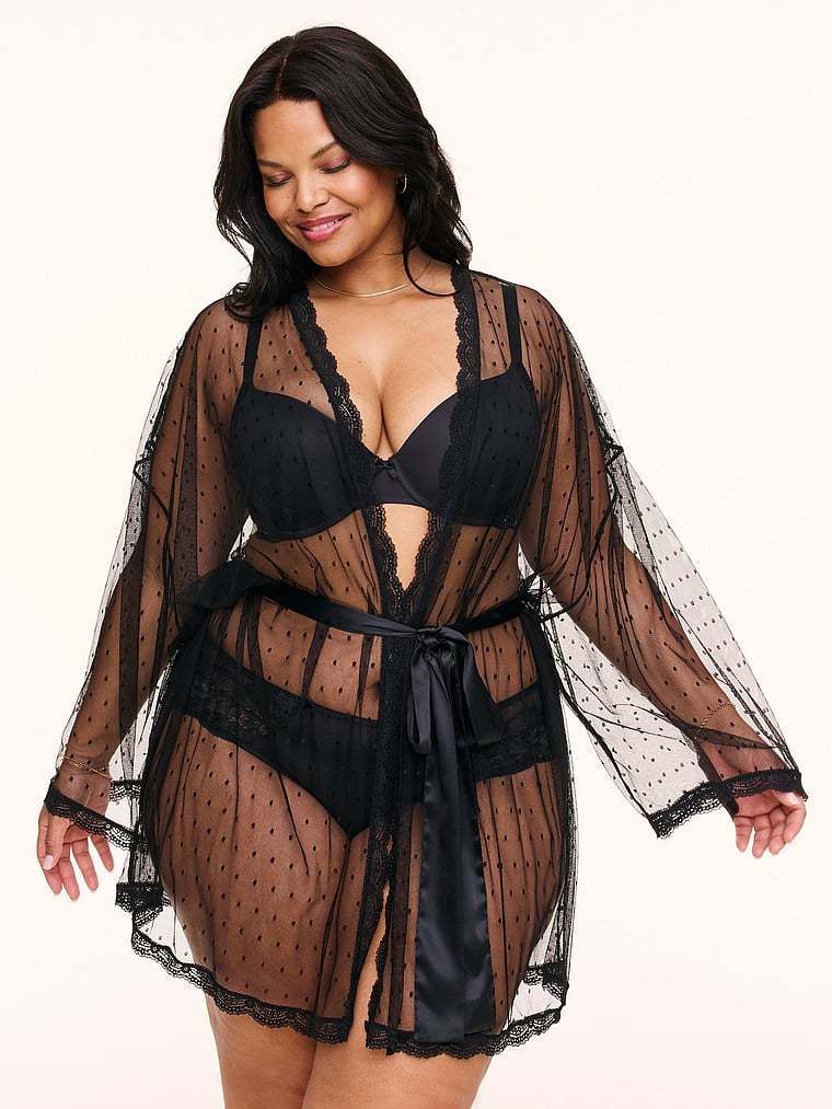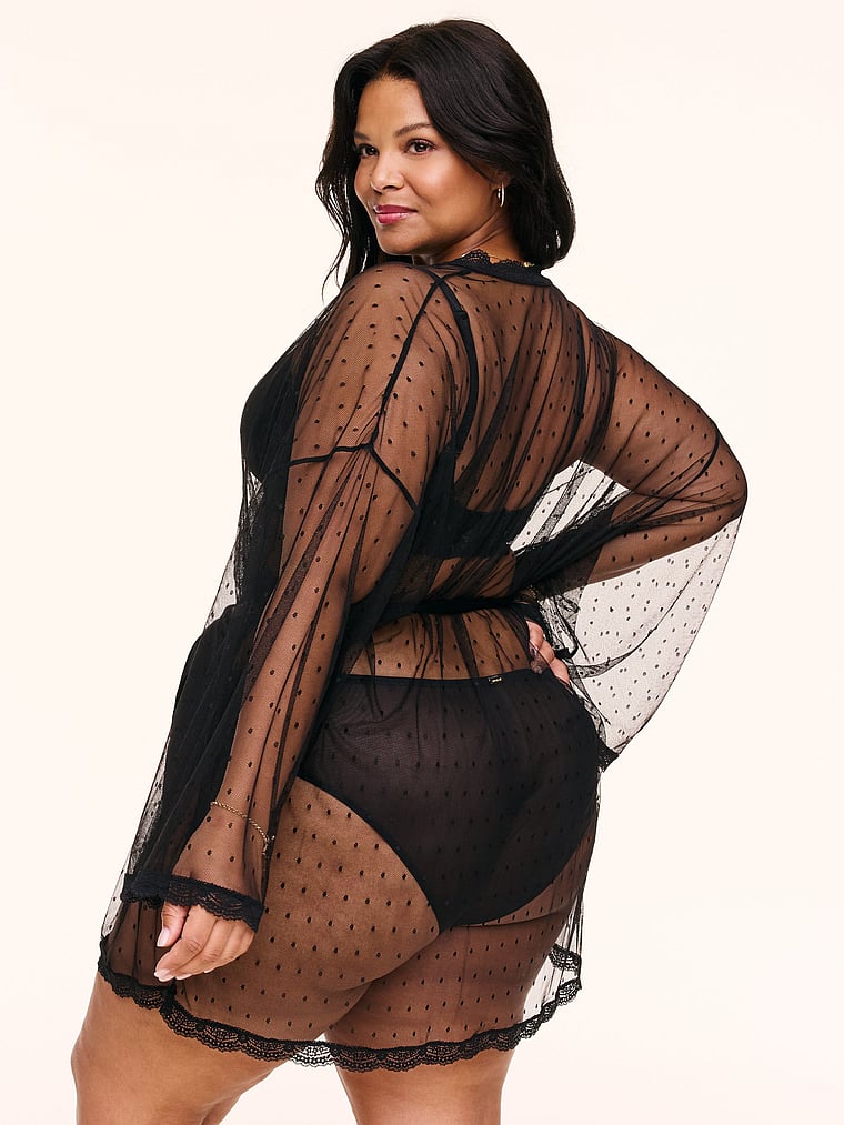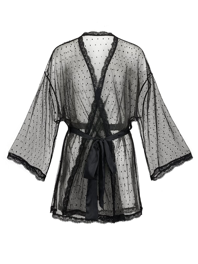 The dot mesh fabric is soft and lightweight, and the lace trim and satin tie add a luxurious feel. This robe is perfect for a romantic night in.