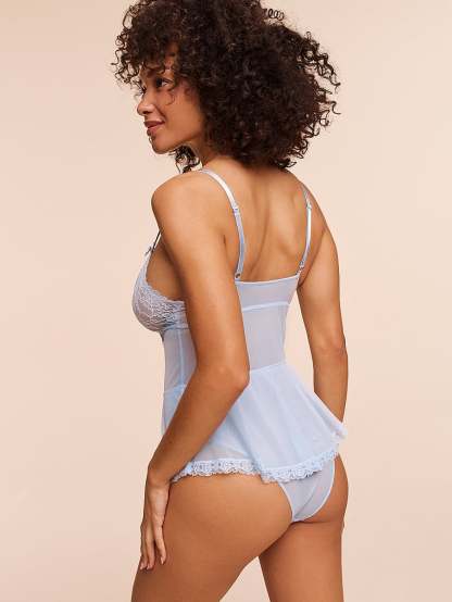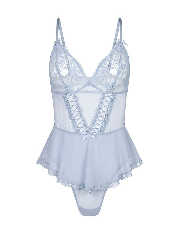 This sexy silhouette is crafted from glamorous, sheer mesh and features daring, unlined triangle cups. A sweet, peplum skirt adds a feminine finish.