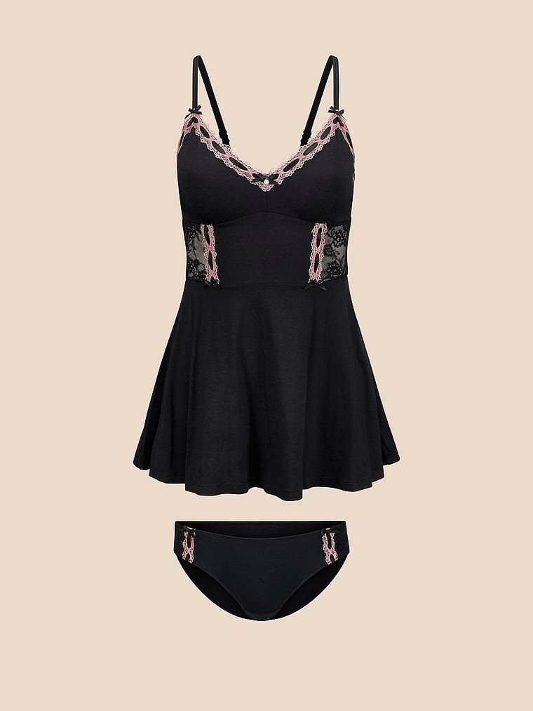 Fun and feminine, this set is equal parts PJ and lingerie, with a top with double-lined cups and lace detailing and a matching hipster panty.