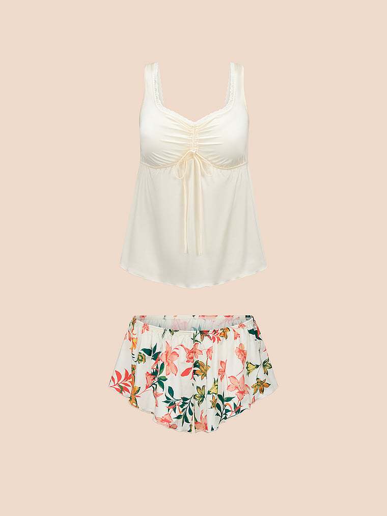 All set for every kind of slumber. This pajama set features a scoop neckline with feminine lace trim and a drawstring to adjust your coverage as you wish. Comes with matching shorts with an elastic waistband and a flirty fit.