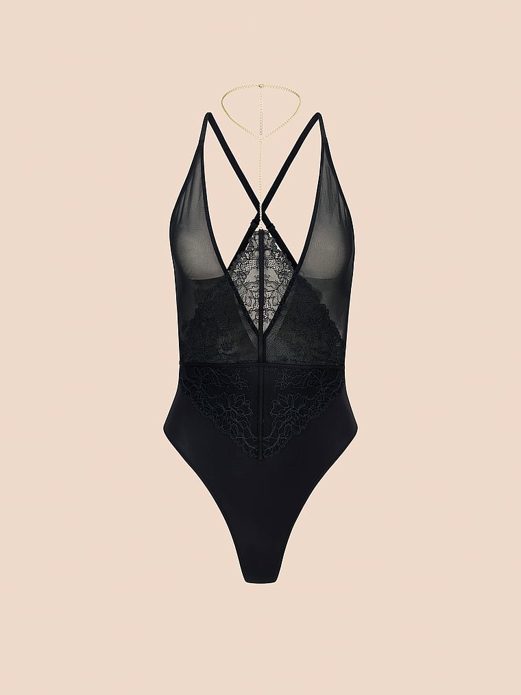 This bold lace bodysuit features a deep plunge neckline with adjustable straps for the perfect fit. Includes a built-in necklace for added style.
