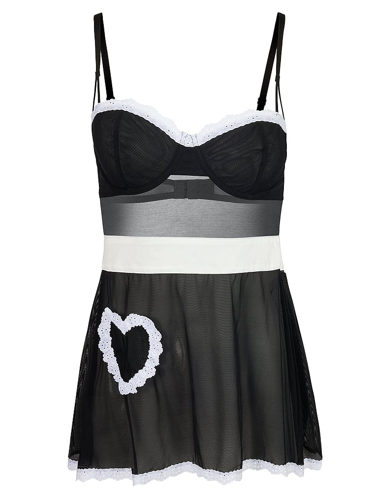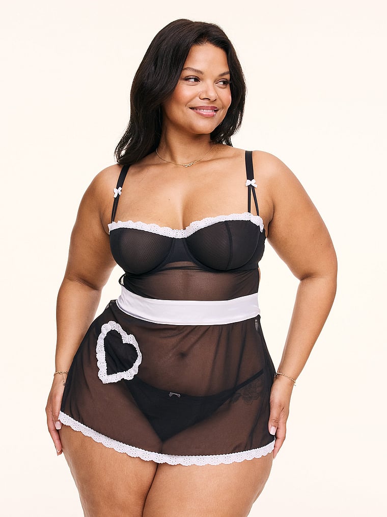 This sexy babydoll is a fantasy come true — made of all-over mesh. Featuring underwired, unlined balconette cups, a functional heart-shaped pocket, adjustable straps, hook and eye back closure, a matching g-string, and a self-tie apron.