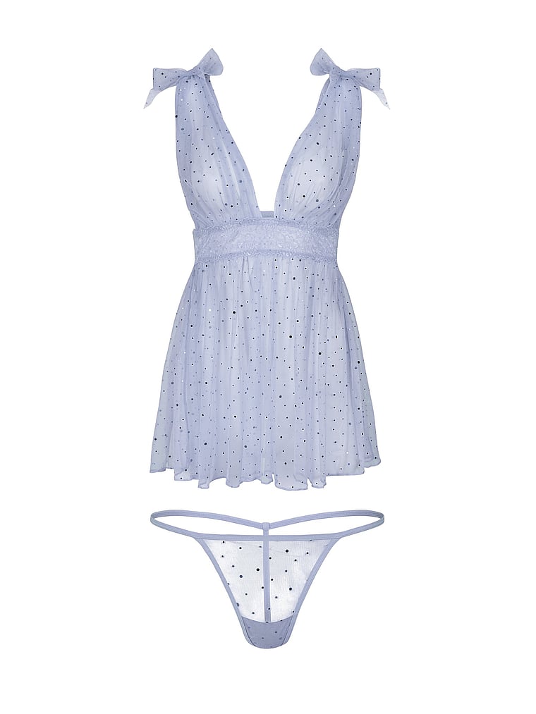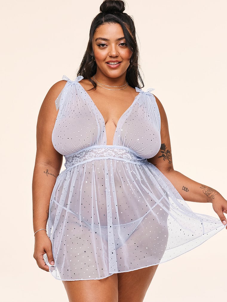Sparkly and romantic, this Babydoll is made with shimmering mesh and lace trim with adjustable straps. A matching G string panty completes the look.