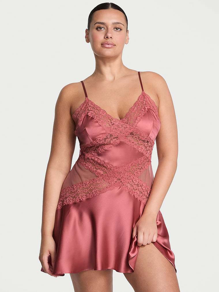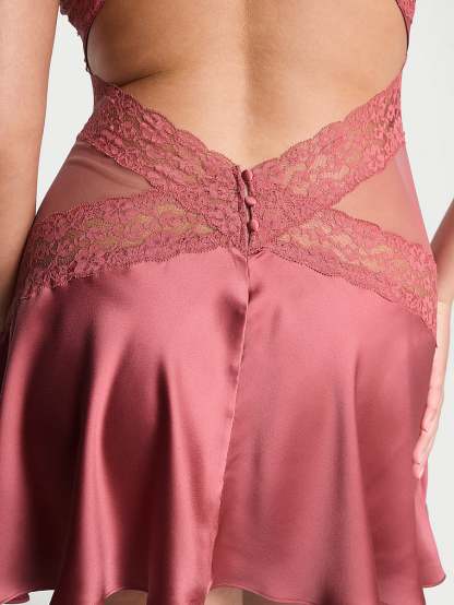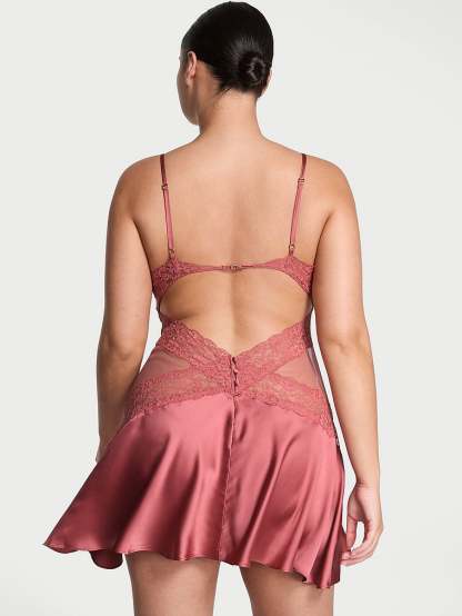 Slip into something a little more fabulous with this dreamy satin design. Sheer lace trim and tulle panels offer a sexy glimpse beneath, while the low-cut back adds more drama.