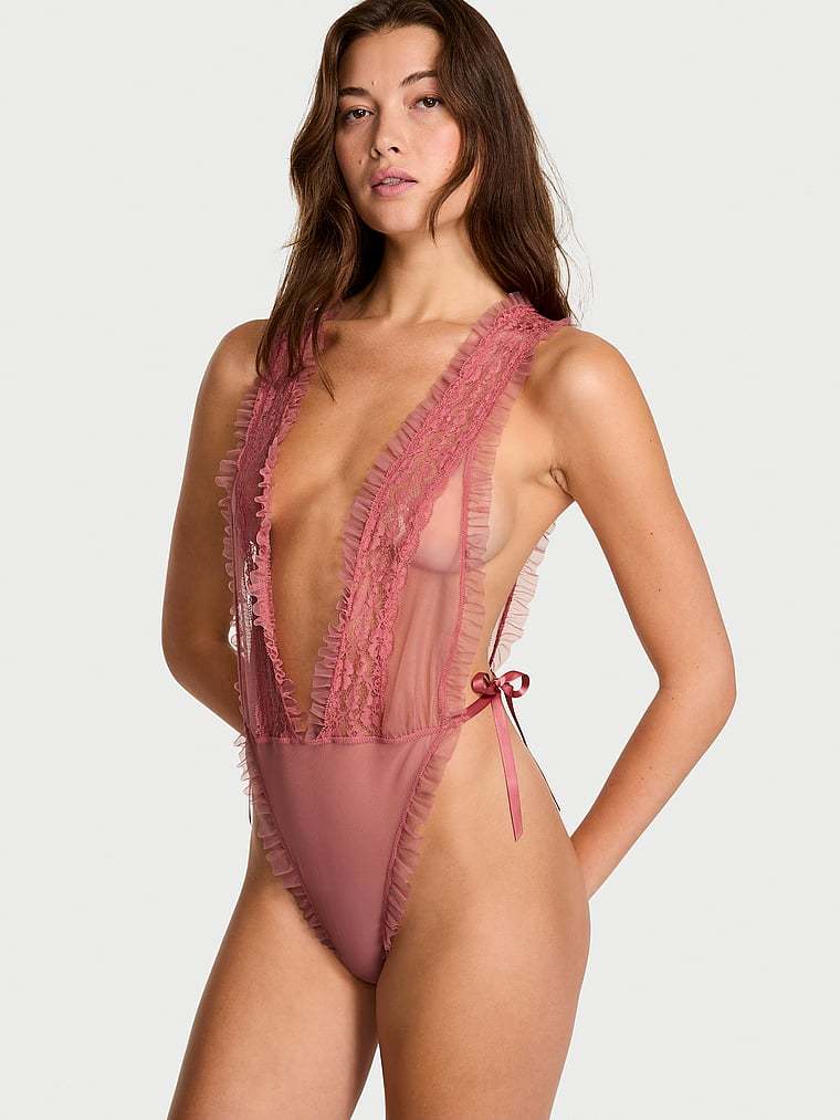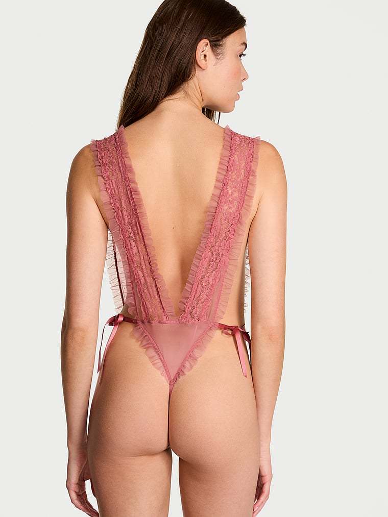 Sheer and super-seductive, this plunging design features gorgeous lace and flirty ruffle details. The lengthening, ultra high-cut leg finishes at the waist with adjustable satin ties.