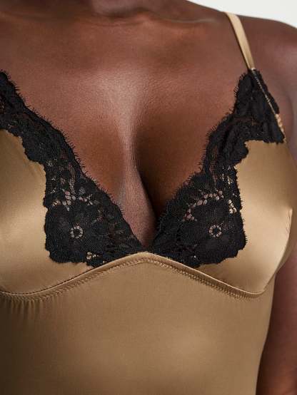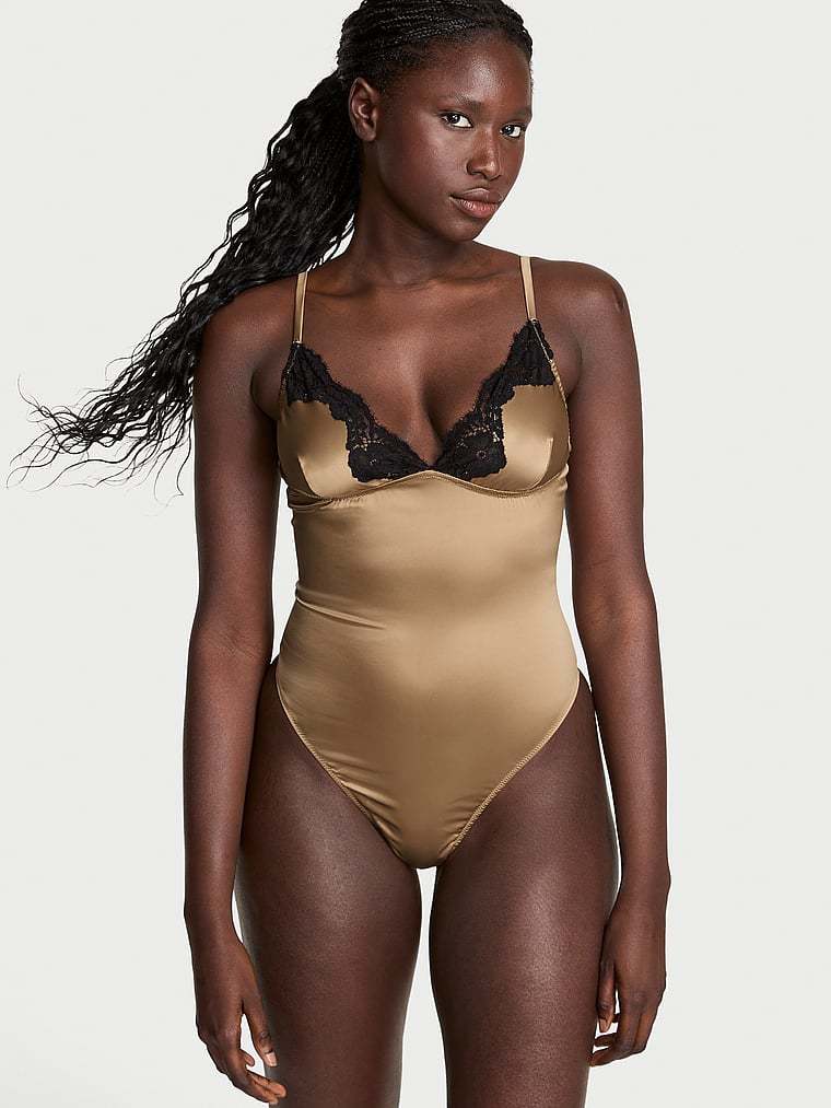 Designed in glossy, curve-hugging stretch satin, this sexy plunge-neck Bodysuit goes on easy with an invisible back zipper and adjustable straps. A touch of luxe lace finishes the look.
