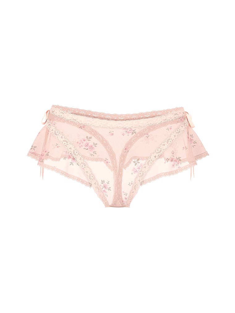 This sexy-cut, mesh pair gets even flirtier with a romantic floral print, ruffled sides, and a pair of bows. A touch of lace ups the femme factor.