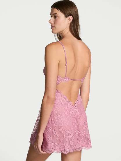 Where delicate meets dazzling. Topped off with dainty rows of crystals at the straps, this mini is crafted in our feminine lace with a plunging neckline and stunning open-back design.