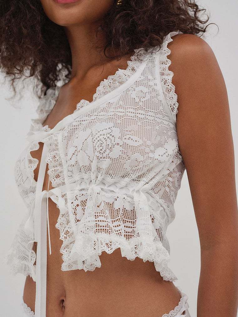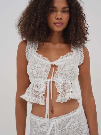 Become a vintage Muse in the Antique sheer lace top—a cropped open front top with functional ribbon ties crafted in antique-inspired floral lace and adorned with ruffled lace trims.