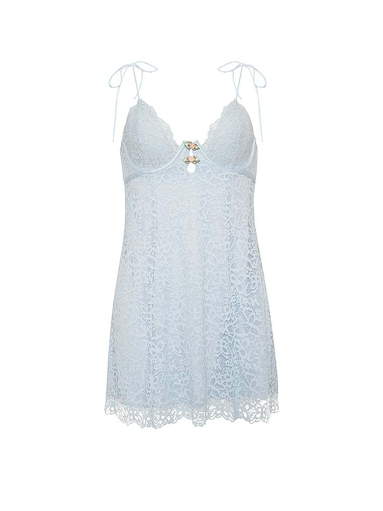 Butterflies sweep across this luxe lace design finished with skinny shoulder straps, a duo of rosettes, and a row of covered buttons in back.