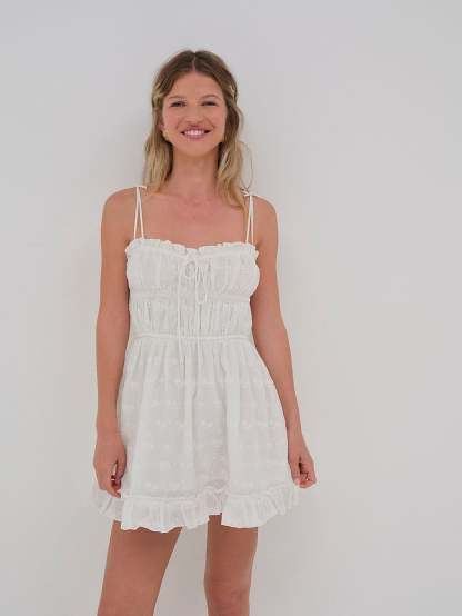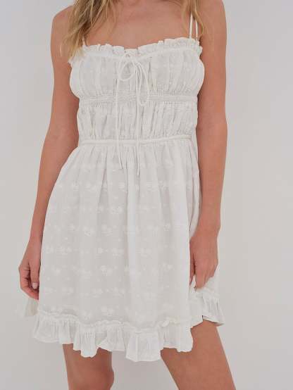 This oh-so pretty, ultra-feminine Dress boasts a ruched bust panel and bodice and a gathered skirt. It's adorned with inset lace trim at the underbust, a pearl flower, and a skinny lingerie bow.