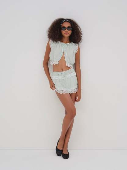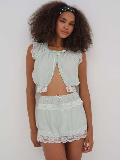 - Lace trim and bow detail