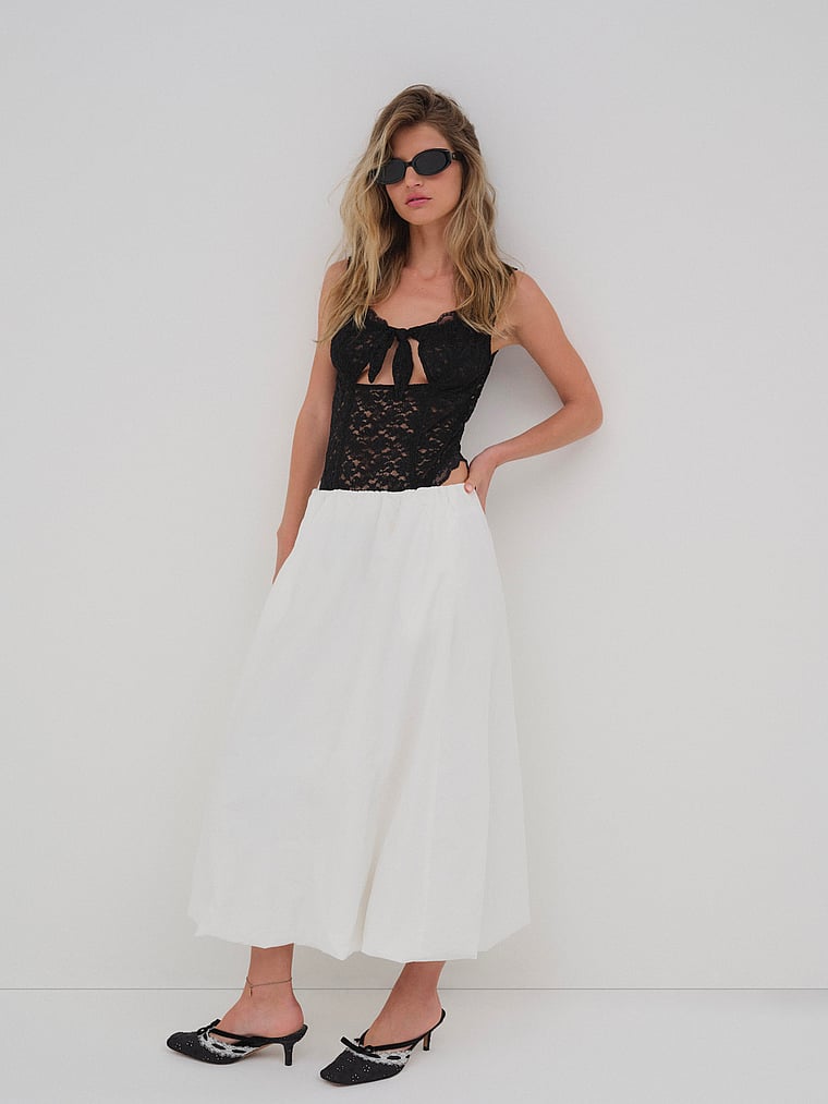 This lace bodysuit is for the effortless beauty. Crafted in an intricate floral stretch lace, this lace teddy features a cheeky back panty fit, keyhole cut out at front with functional knot tie, a low open back with functional tie, and is adorned with lace trims throughout.