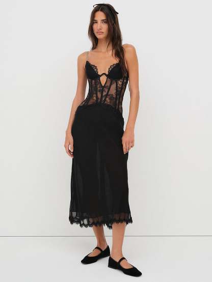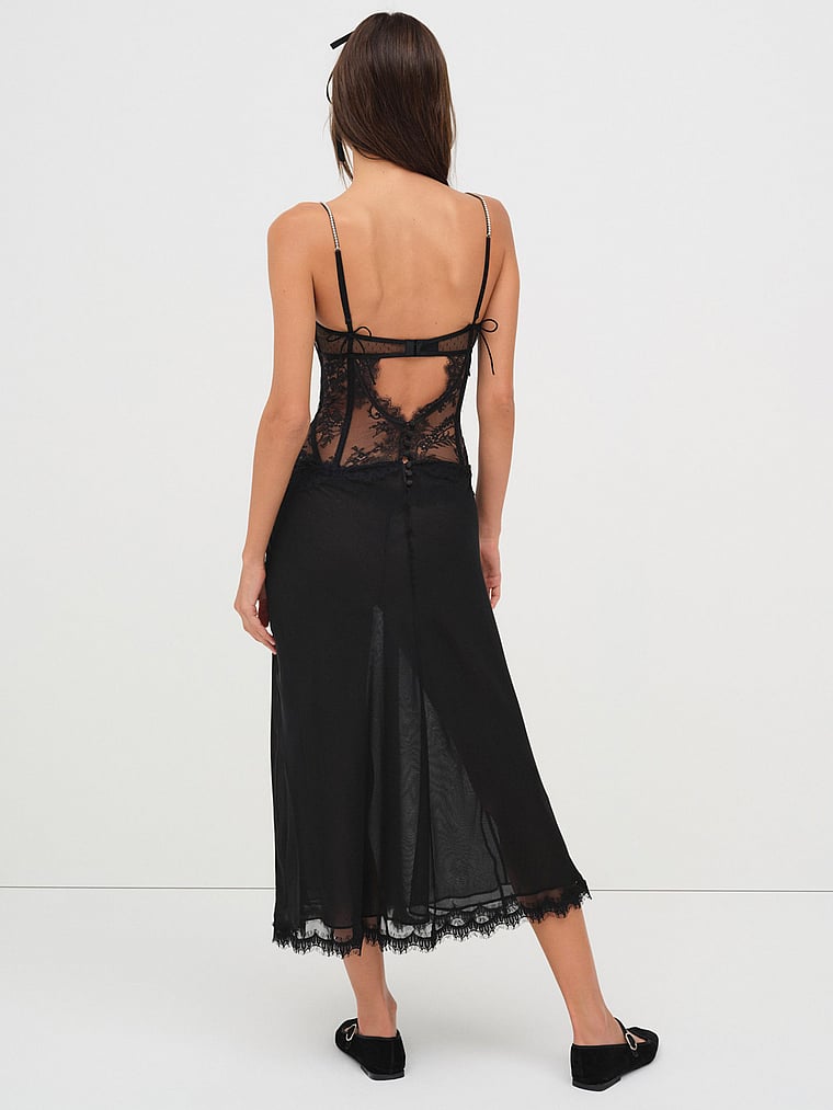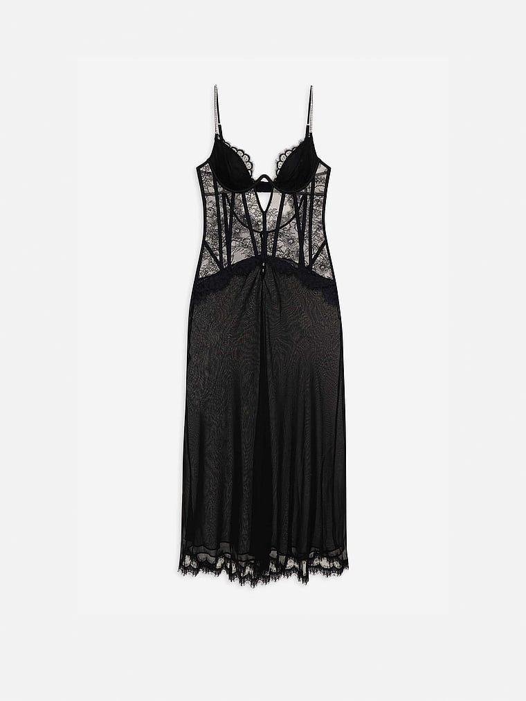 So sexy. This slip dress is crafted in chiffon with shimmering rhinestones as adornment. It also features underwire cups and a fully boned waist bodice.