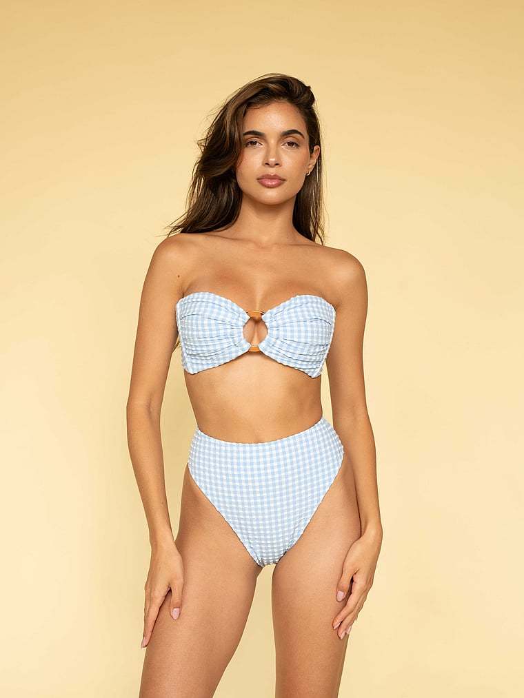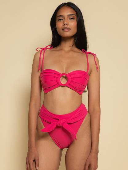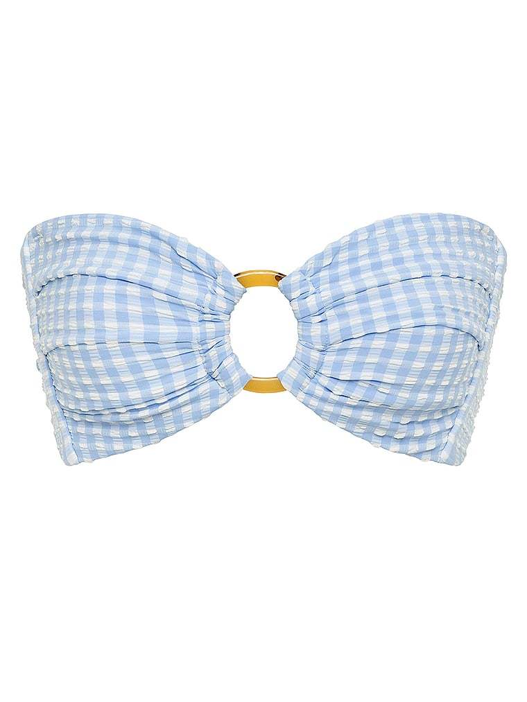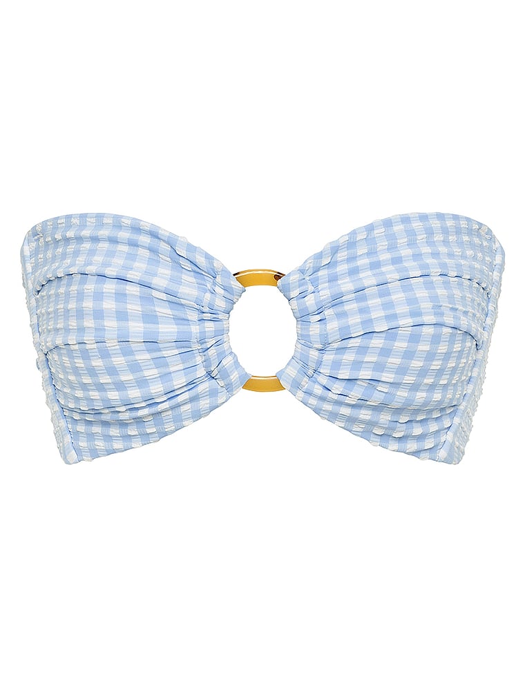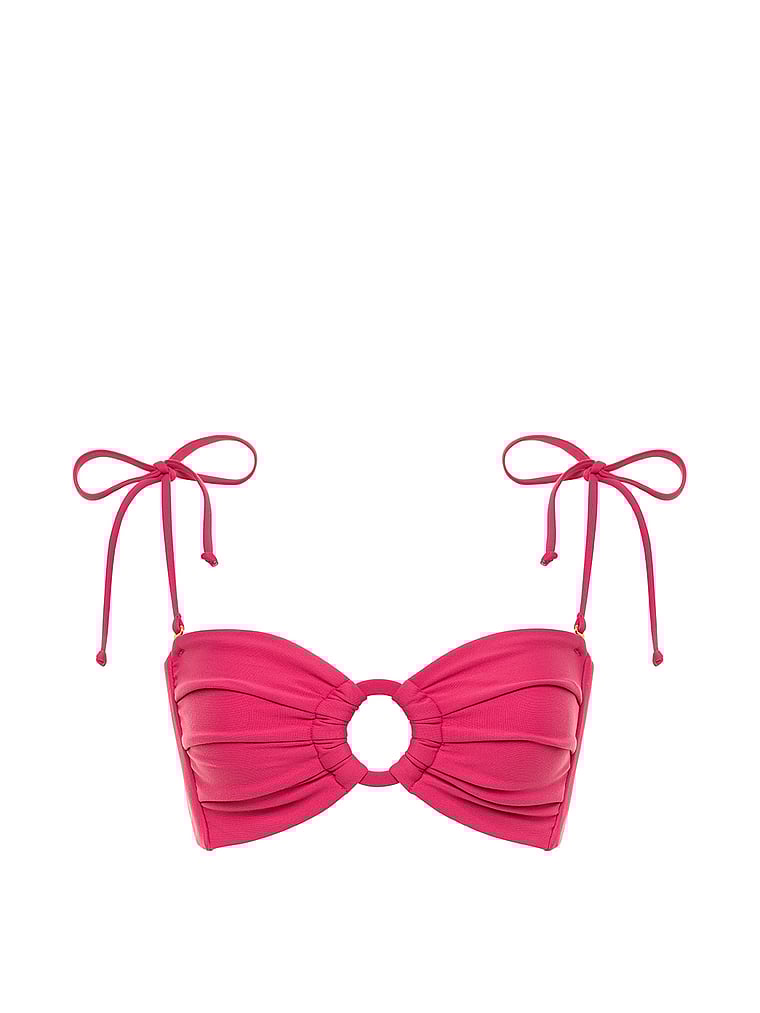 Fabric covered hardware turns heads in this bandeau bikini top. It offers medium support with side-seam boning and an adjustable self-tie closure at the back. A flattering sweetheart neckline and ruched detailing are pretty, too.