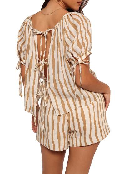 Meet Maggie—your new favorite summer set. A breezy Top with a relaxed silhouette gets a wistful finish thanks to self-tie details and an open back. High-waisted Shorts with a comfy, elastic waistband complete the look.