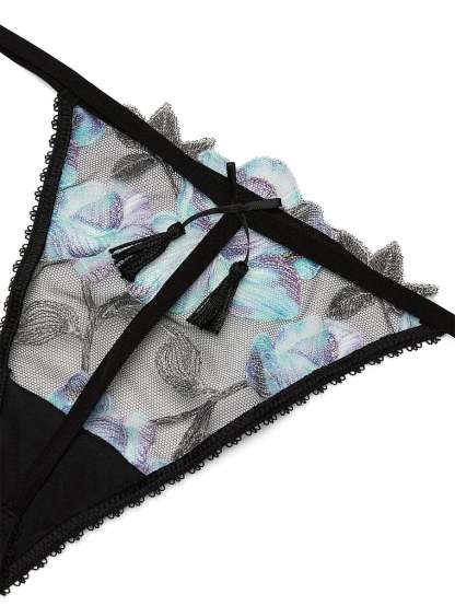 Richly hued, moody blooms are artfully embroidered on our little V-String Panty. A dainty tasseled bow finishes the design.