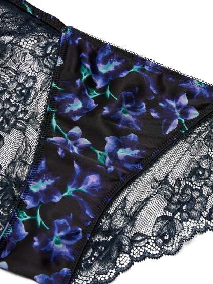 Stunning lace backs up this smooth, printed-satin pair, bringing a sexy rear view to the cheeky style.