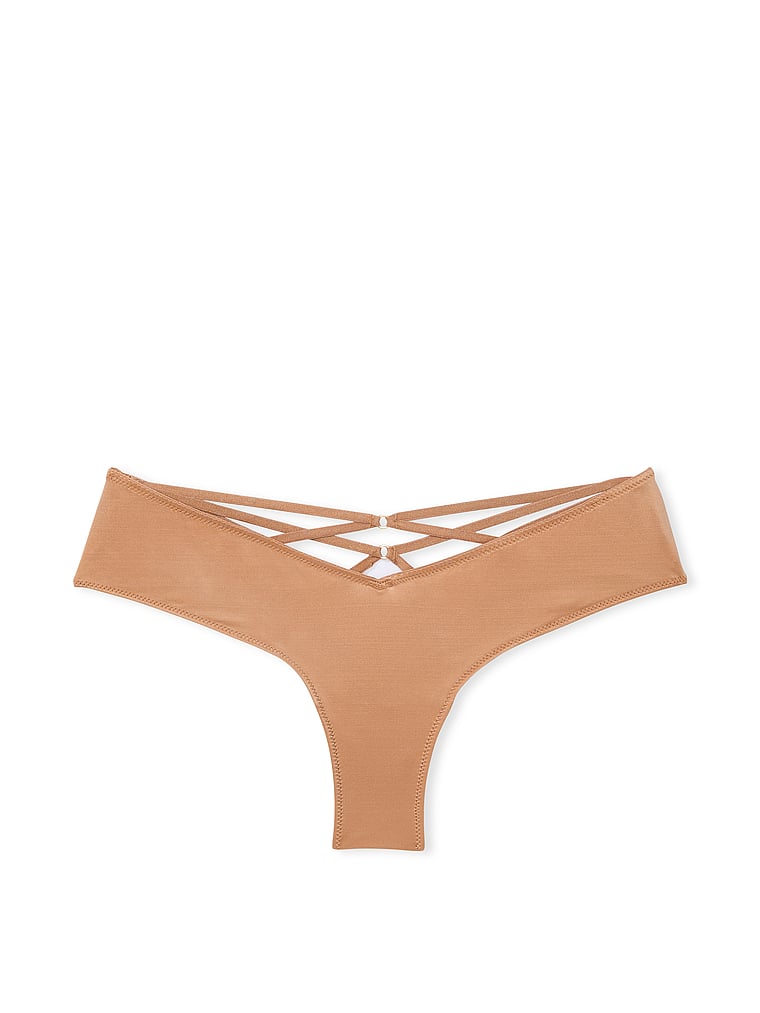 A V-cut front and strappy details on the back of this silky-smooth pair add unexpected, sexy touches.