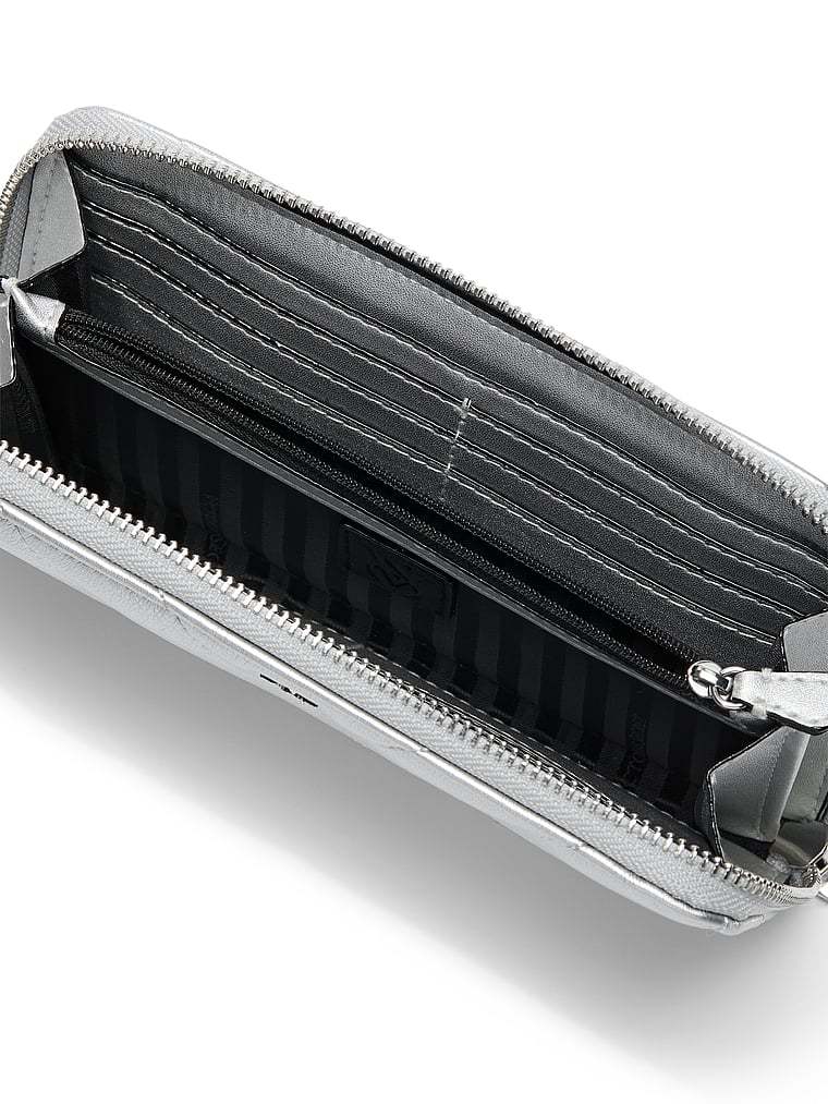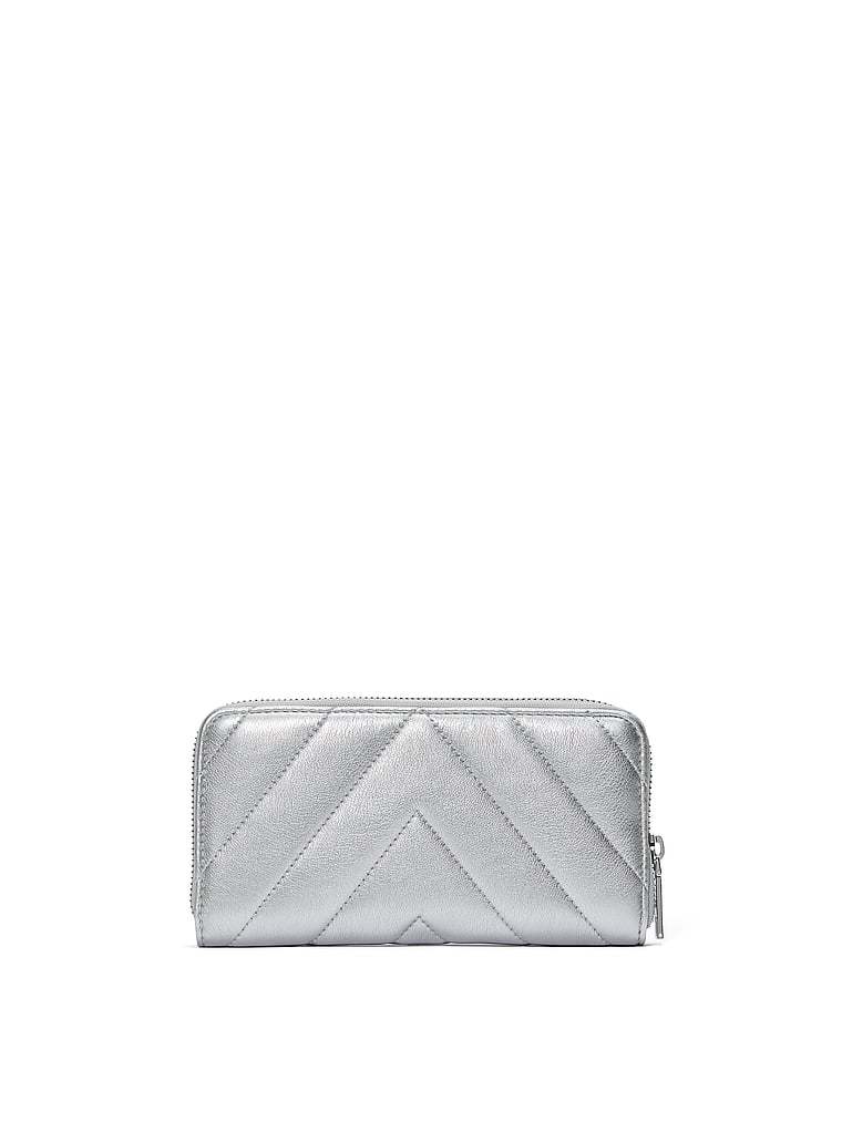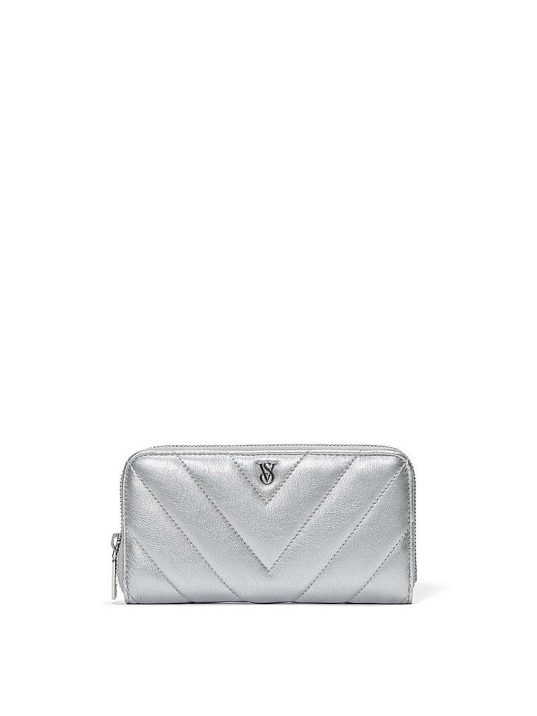 An allover V-quilt pattern and VS logo hardware define this sleek metallic wallet. A wrap-around zip and plenty of interior pockets keep everything contained and organized.