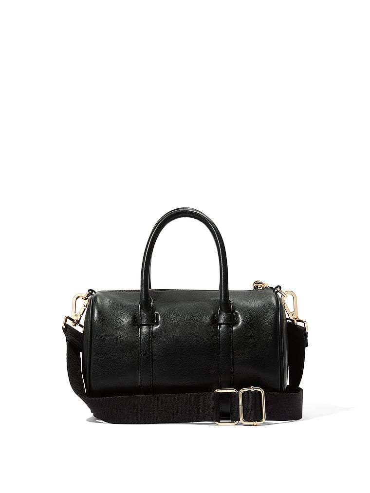 Storage meets style with this barrel-shaped mini duffle. Featuring top handles and a removable crossbody strap for carrying convenience. Ultra-soft faux leather and refined stud detailing add an elevated touch.