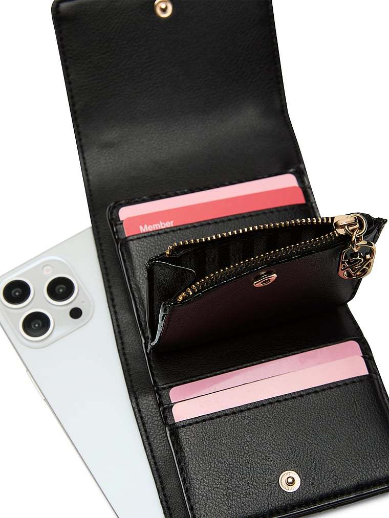 Just the necessities. This small tri-fold wallet includes interior slot pockets plus a center zip pouch for coins and other small items. Featuring woven faux leather for intricate, sophisticated style.